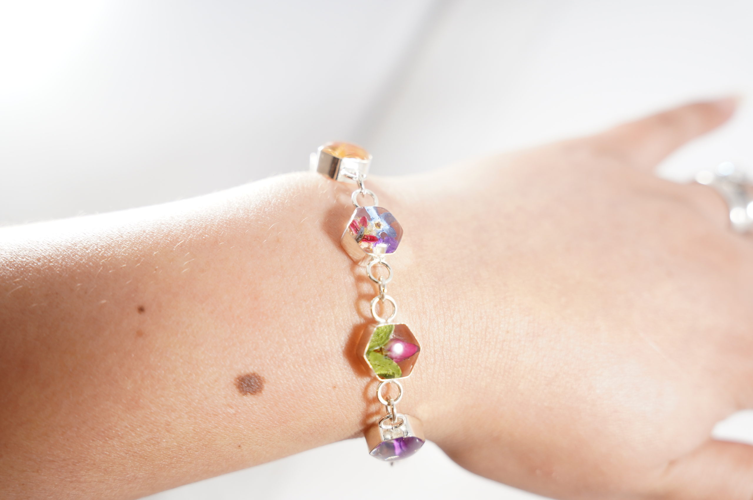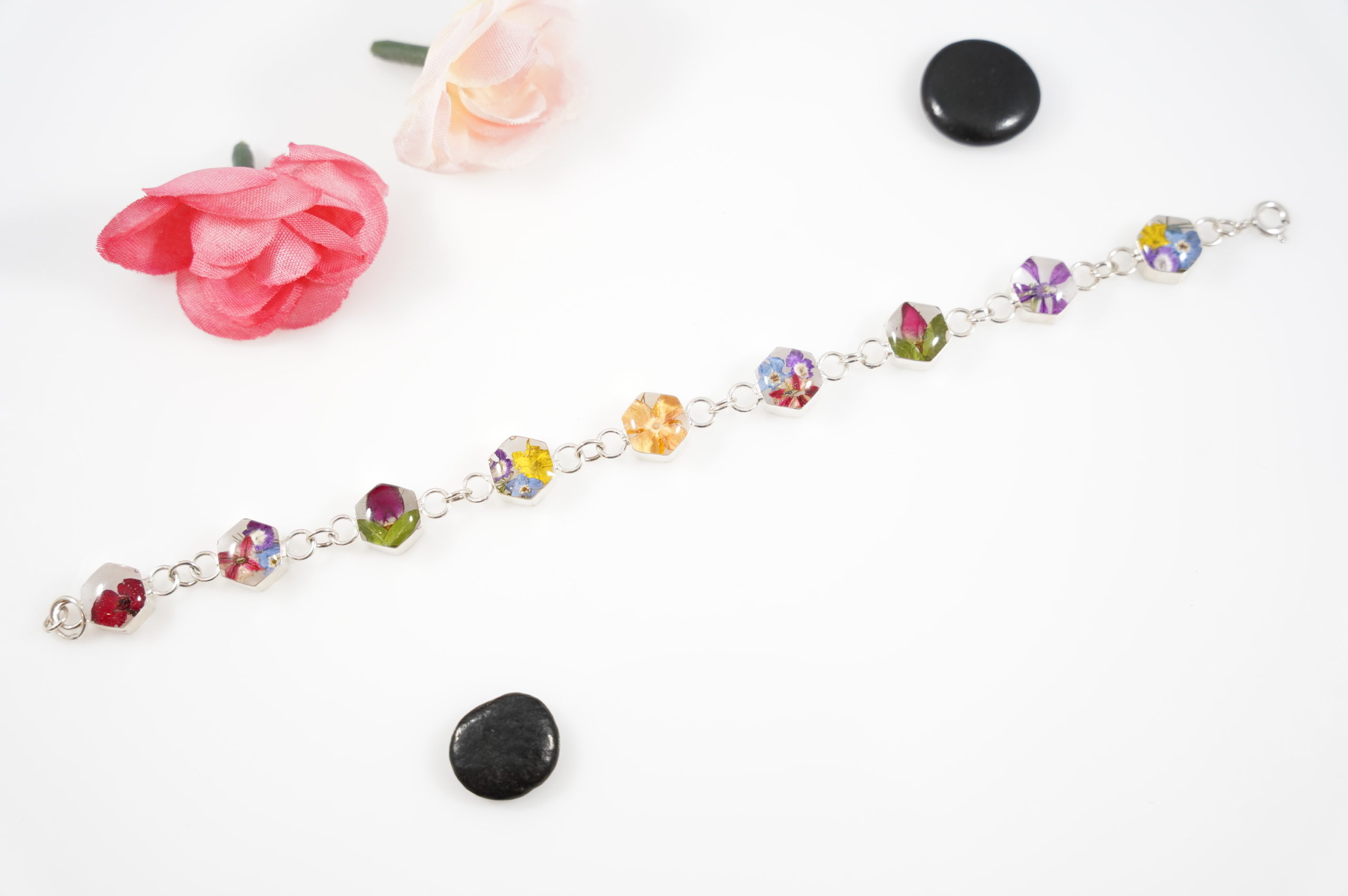 Beautiful sterling silver bracelet made with real flowers in hexagon shaped resin.